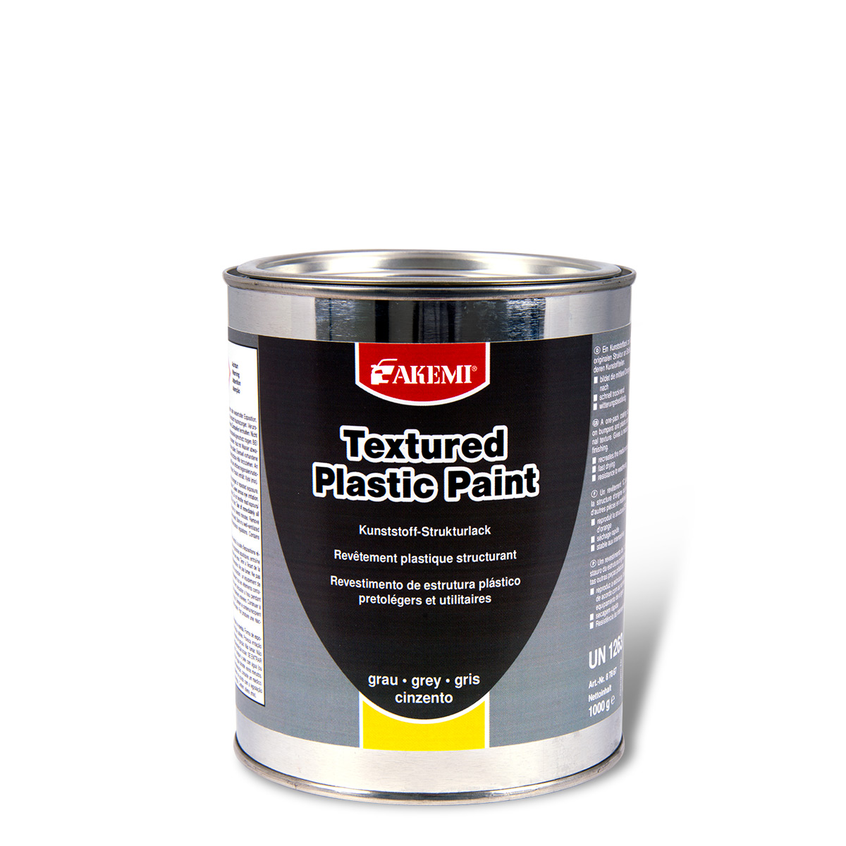 Lata de tinta texturada para plástico cinzenta da marca Akemi sobre fundo branco
