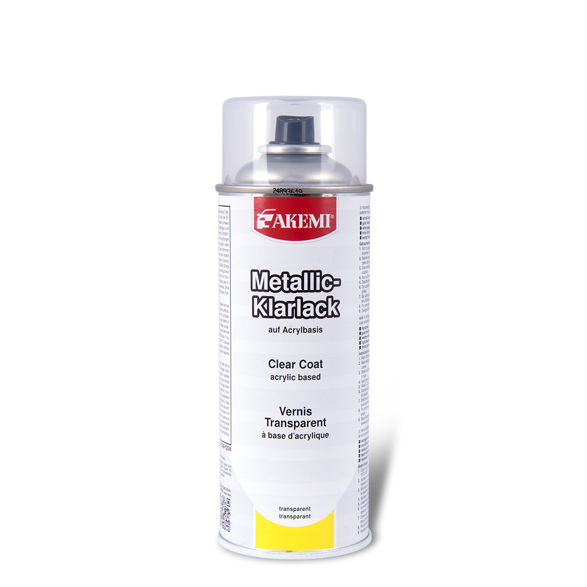Spray verniz transparente Akemi Metallic-Klarlack em embalagem branca com tampa transparente