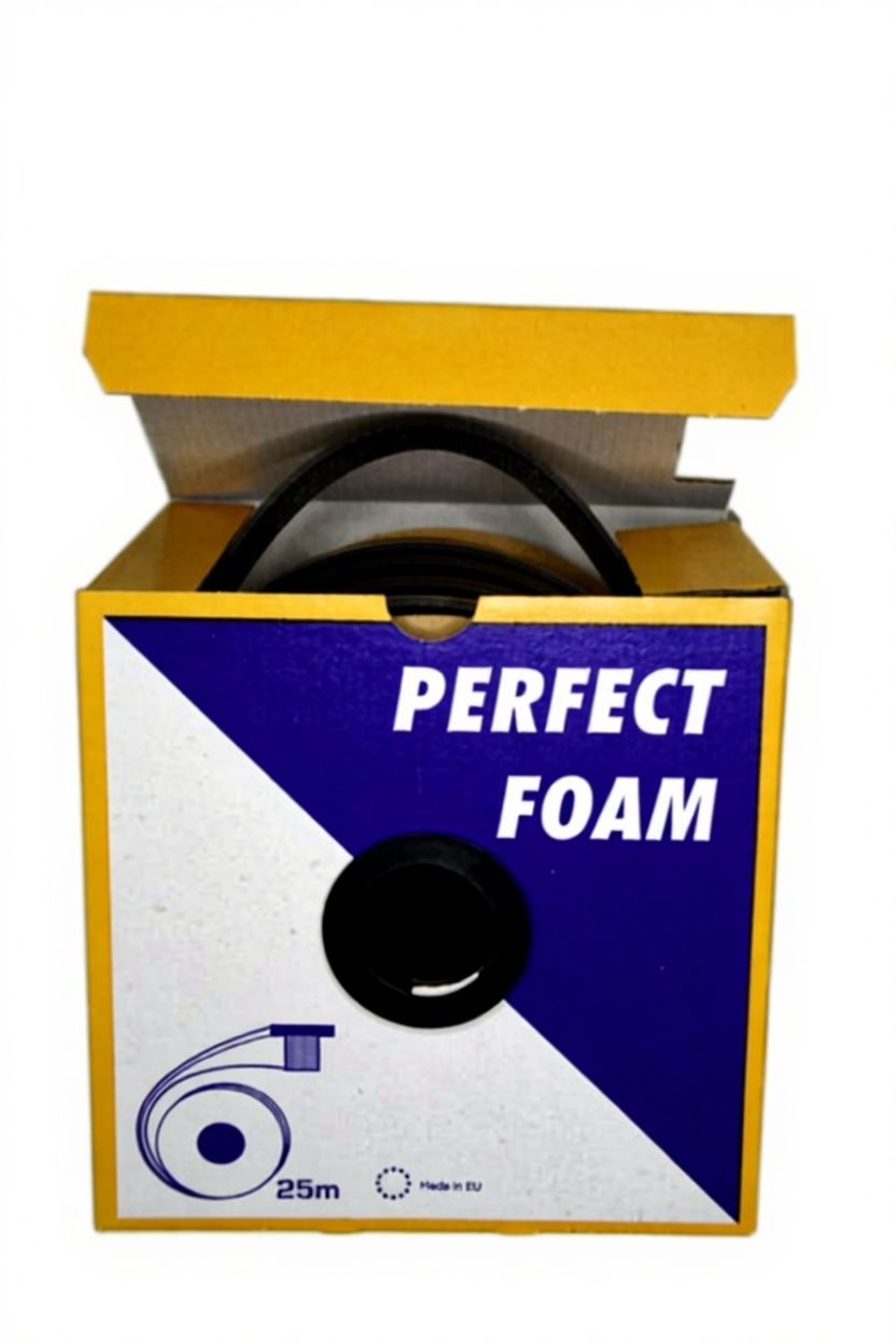 Caixa amarela com produto preto e etiqueta PERFECT FOAM